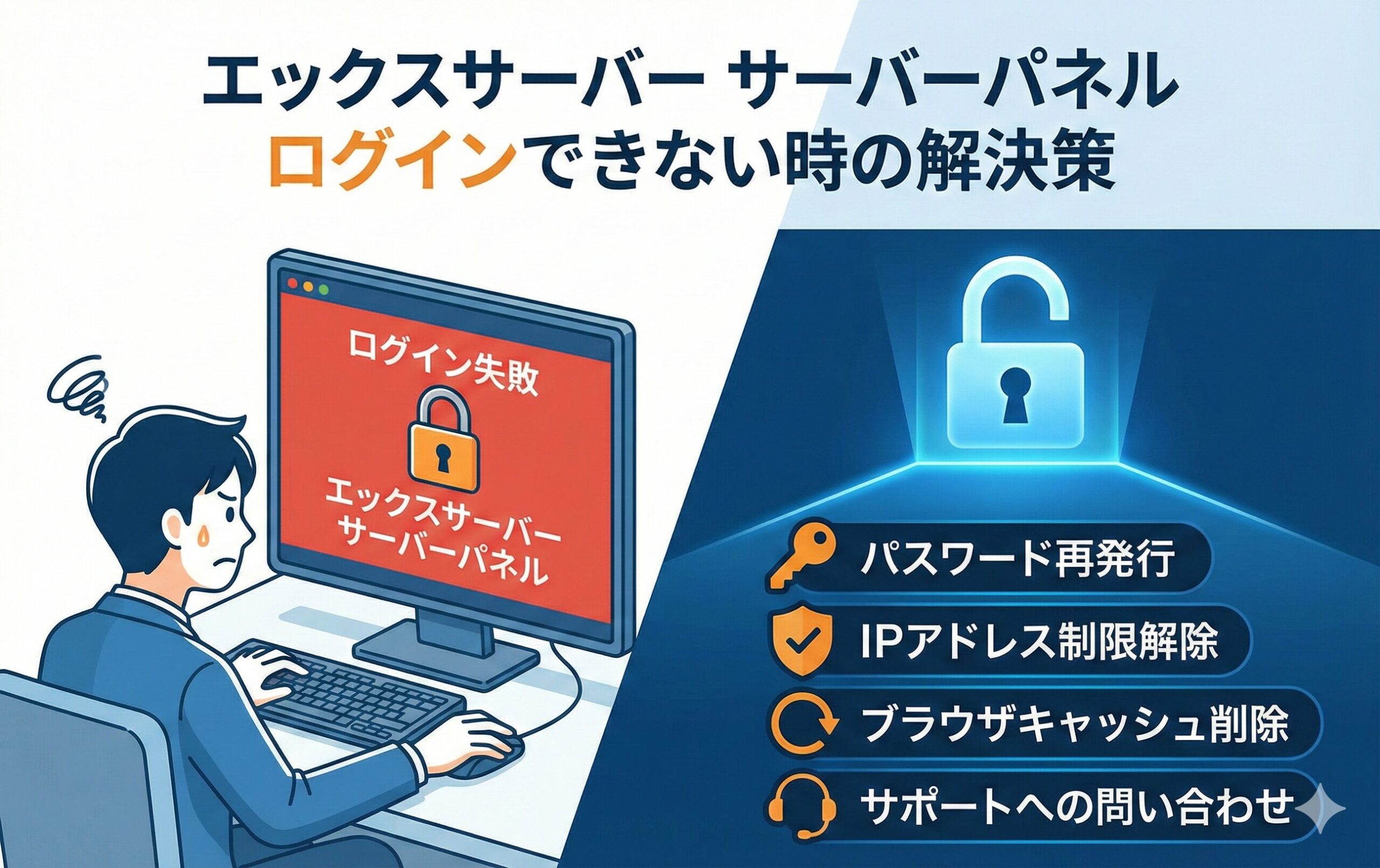 標準的レンタルサーバー、運営者の吉岡です。エックスサーバーのサーバーパネルにログインできなくて、今まさに画面の前で困り果てているあなた。まずは、深呼吸して落ち着いてくださいね。ログインできないトラブルは、どんなにベテランのWeb担当者でも一度は経験する道ですから、全然恥ずかしいことじゃないですよ。「サイトが表示されない!」「設定が変えられない!」という焦る気持ち、私も自分のサーバーで同じ経験をしたことがあるので、痛いほどよくわかります。